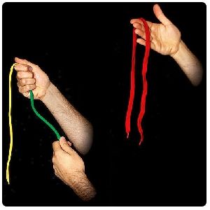 The performer shows a yellow lace in his left hand, he slowly pulls it through his fist and the lace changes color becoming green. He displays the green lace, but in doing so, he suspiciously keeps his left hand closed… at this stage everybody will think that the yellow lace is hidden in the performers left hand, but to everybody’s surprise the magician shows that in this hand he actually has another lace, but that it is RED, while the yellow one is later taken out of his jacket pocket.