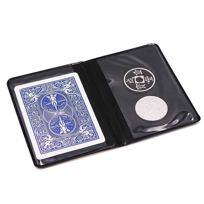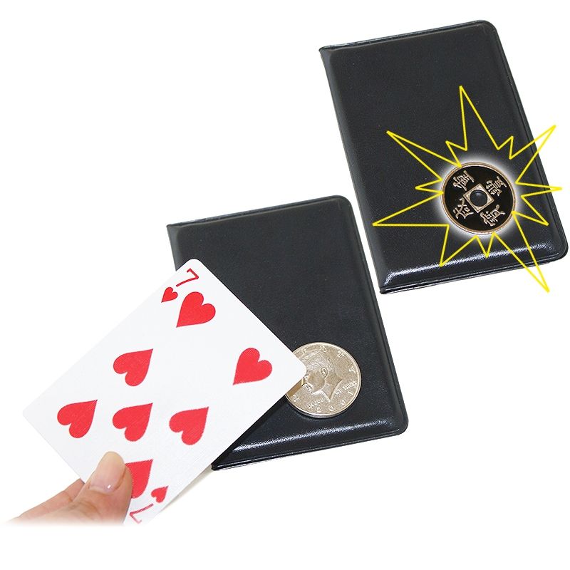 The magician shows a small wallet containing a playing card, a half dollar coin, and a Chinese coin that has a hole in it. He takes out the card and the half dollar, leaving the Chinese coin in the wallet. He puts the half dollar on the wallet, taps it with the card instantly and visibly changing it into the Chinese coin! Whenthe wallet is opened, the half dollar is found inside.